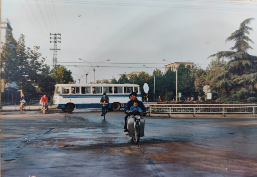 ▲90年代初,荊門(mén)市象山大道街景(?;坜D(zhuǎn)盤(pán))。道路上車(chē)輛很少,公交車(chē)、摩托車(chē)、自行車(chē)是主流。