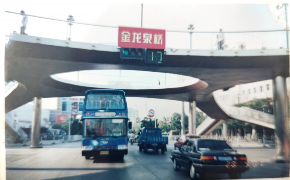 ▲00年代初,荊門(mén)市象山大道街景(金龍泉橋)。荊門(mén)市首輛雙層巴士與首座天橋同框。