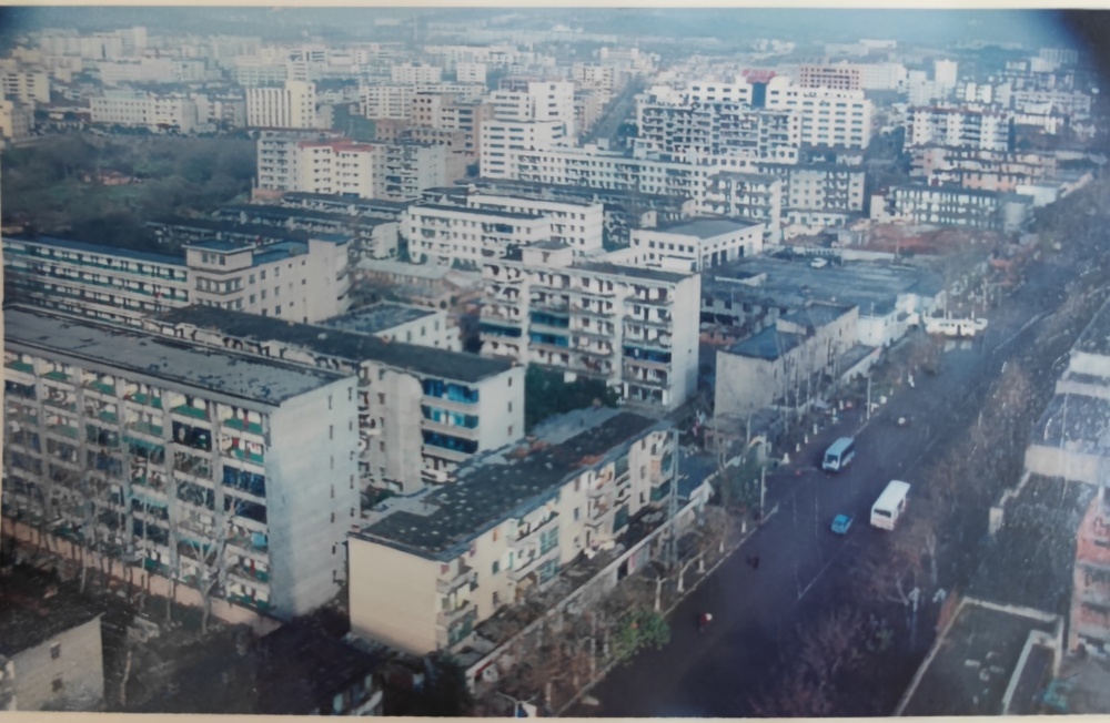 ▲80年代末,荊門(mén)市長(zhǎng)寧大道街景圖。荊門(mén)公交集團(tuán)總公司(舊址)位于長(zhǎng)寧大道西側(cè)。當(dāng)年總公司院內(nèi)建有辦公樓、停車(chē)場(chǎng)、機(jī)修車(chē)間、機(jī)加車(chē)間、油庫(kù)、倉(cāng)庫(kù)。
