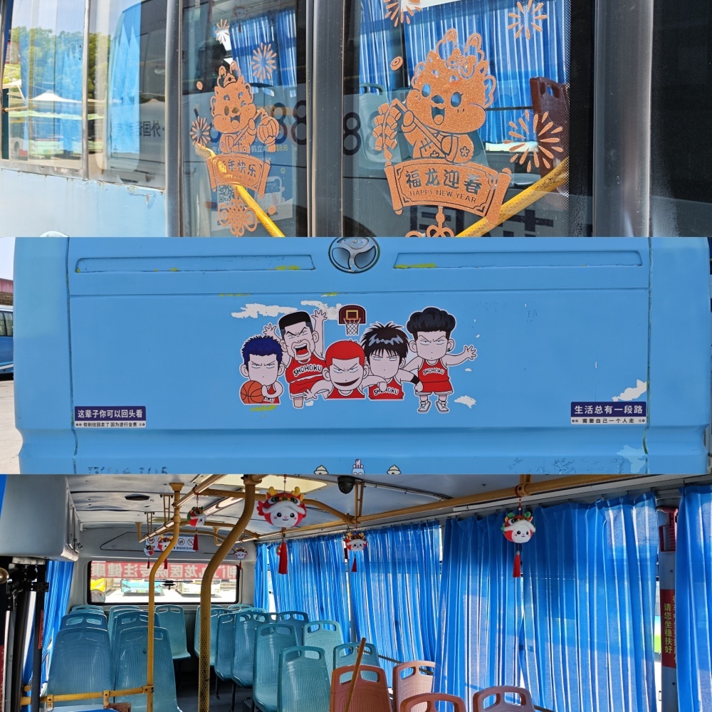 2020#車(chē)還有另外幾處細(xì)節(jié),引起小編注意,上下車(chē)門(mén)處貼有卡通人物和“福龍迎春”貼紙,車(chē)尾部貼有“灌籃高手”人物貼紙和提示標(biāo)語(yǔ),車(chē)廂內(nèi)的扶手桿則掛滿了喜慶娃娃??吹竭@些裝飾和布置,仿佛感受到了駕駛員的熱情、認(rèn)真和細(xì)膩。