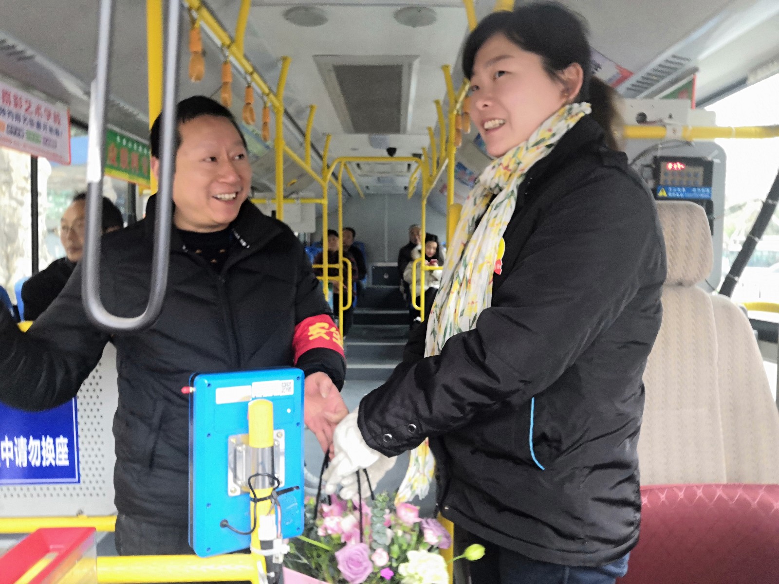 “我代表公司全體男職工,祝你們節(jié)日快樂,永遠美麗?。∵@籃鮮花送給你~”公交信息技術(shù)部男職工羅皓這樣說道,并將一籃鮮花送到正在跑班的公交女駕駛員蘇純菊手中。面對這突來的鮮花和祝福,蘇純菊滿臉驚喜和溫馨,“謝謝,謝謝你們”在道謝聲中,關(guān)上車門,微笑著駛向下一站。