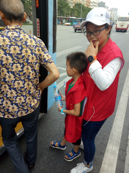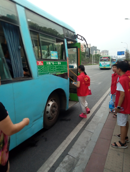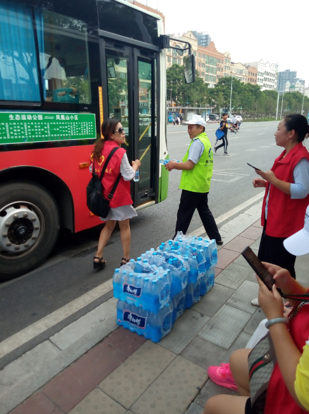 15時許,志愿者們已經(jīng)布置好了送水點,將箱礦泉水?dāng)[在了站臺旁邊。每有一輛公交車進(jìn)站???,志愿者們都會給駕駛員們遞上兩瓶礦泉水,還有一些放暑假的小朋友們,也熱情的加入到此次活動,充當(dāng)著志愿主力軍,用他們的行動清涼了公交駕駛員的心,傳播著社會正能量。