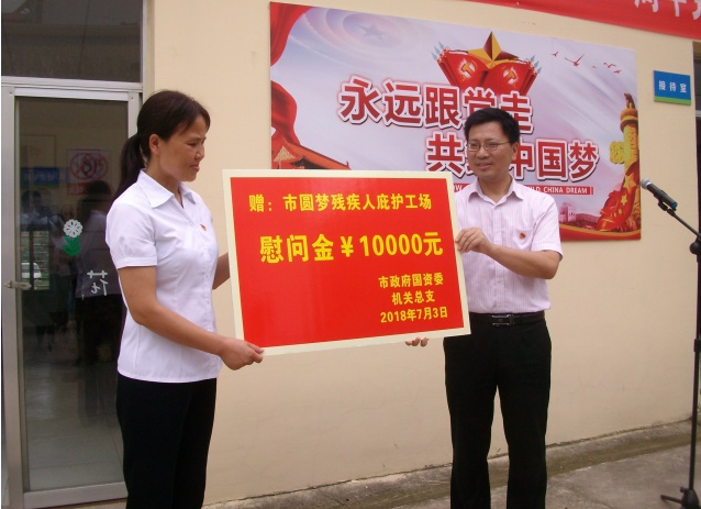 市政府國資委機關(guān)黨總支、市交投集團機關(guān)黨支部、市公交集團機關(guān)黨支部走進市圓夢殘疾人庇護工場,開展“開展“念黨恩、獻愛心”紀念建黨97周年黨員主題黨日活