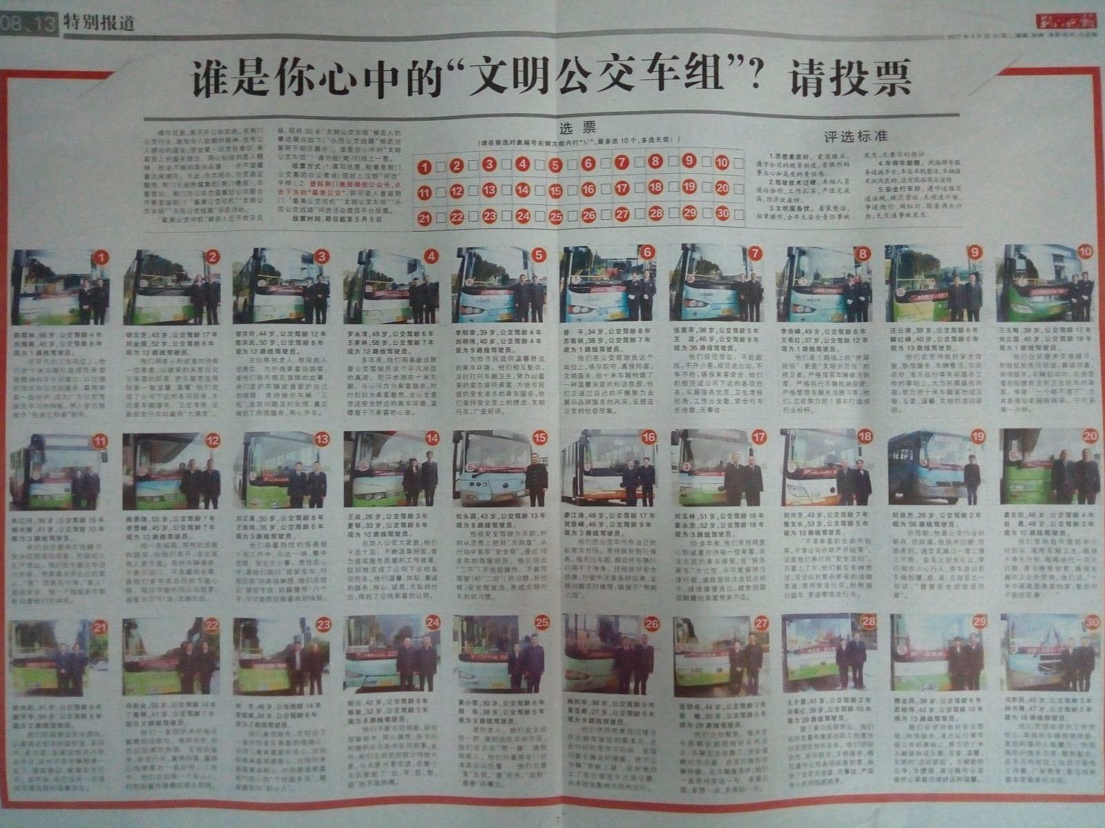 評選投票方式:1.填選選票,郵寄至荊門公交集團辦公室收(信封上注明“評選”字樣)。 2.登錄荊門晚報微信公眾號,點擊下方“最美公交”即可進入首屆荊門“最美公交司機”“文明公交車組”“示范公交線路”評選活動微信平臺投票。