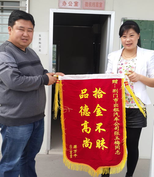 5月4日,乘客蔣女士從市出租汽車公司領回丟失的蘋果iphone5s手機,感動萬分,并送上印有“拾金不昧品德高尚”錦旗,以表達對的姐張玉梅的謝意。