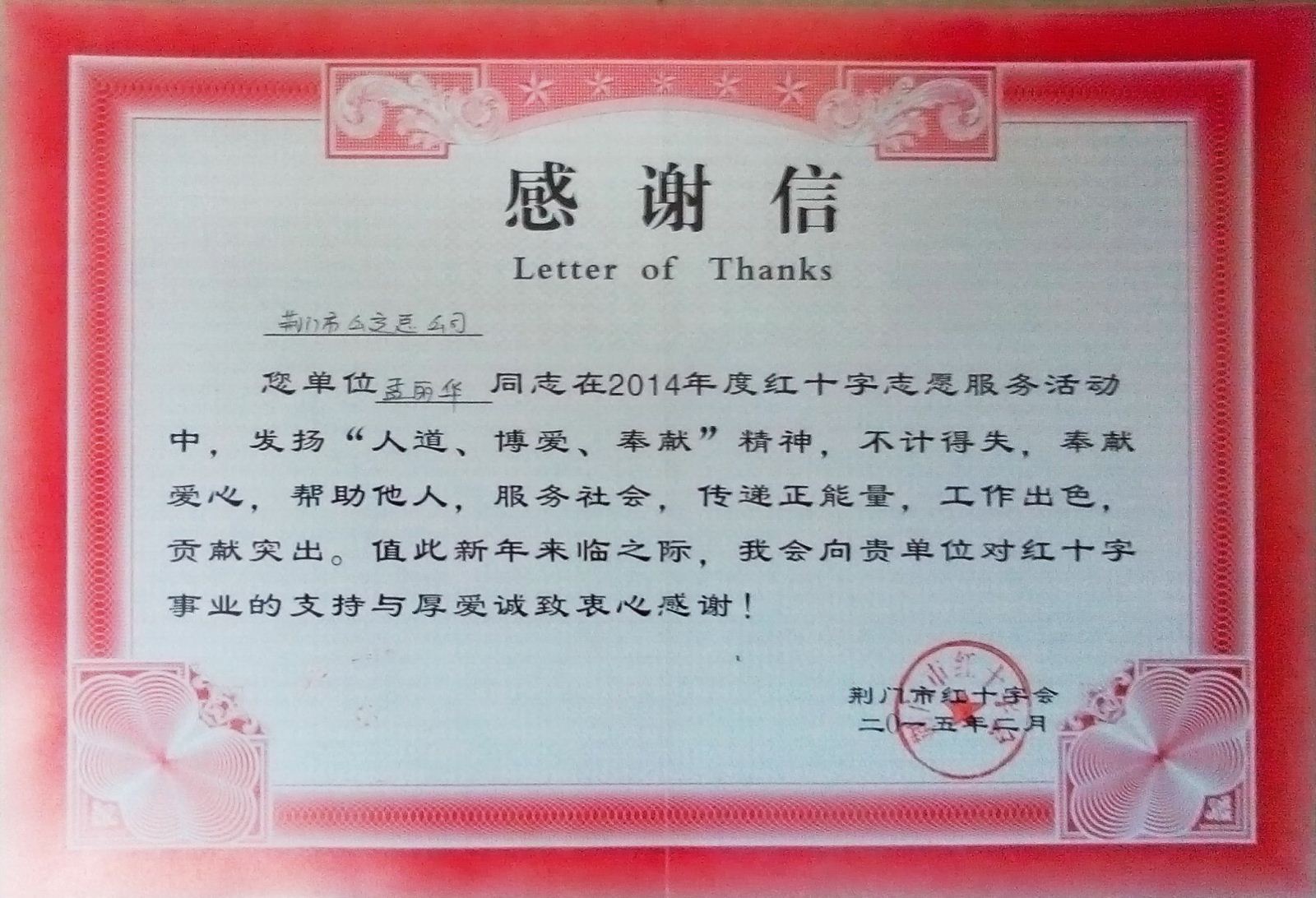 孟麗華收到荊門市紅十字會(huì)感謝信