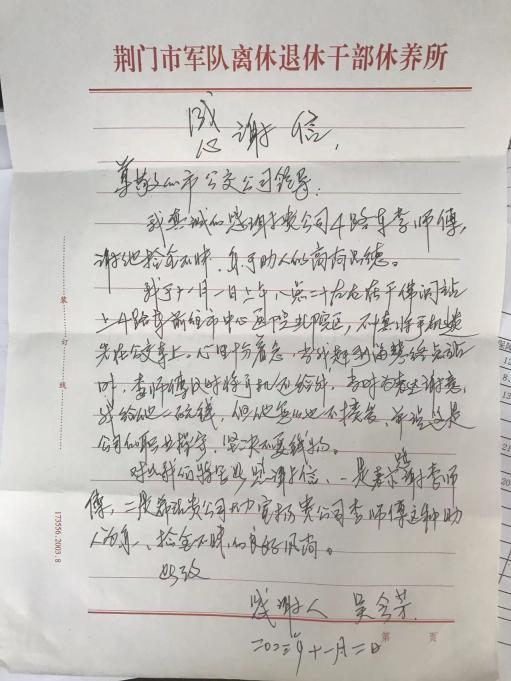 11月6日上午9時(shí),公汽三公司收到由調(diào)度中心代收的一封感謝信,信中寫到“我真誠的感謝貴公司4路車?yán)顜煾担x他拾金不昧。樂于助人的高尚品德”。