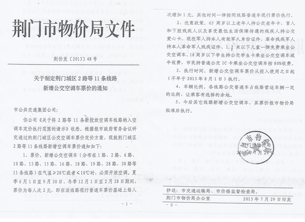 根據(jù)荊門市物價(jià)局《關(guān)于制定荊門城區(qū)公交空調(diào)車票價(jià)的通知》(荊價(jià)發(fā)[2013]46號)及《關(guān)于制定荊門城區(qū)2路等11條線路新增公交空調(diào)車票價(jià)的通知》(荊價(jià)發(fā)[2013]48號),公交空調(diào)車2014年6月1日至9月30日營運(yùn)時(shí)段內(nèi)執(zhí)行2元/人次票價(jià),現(xiàn)就執(zhí)行公交空調(diào)車票價(jià)后的有關(guān)事項(xiàng)公告如下: