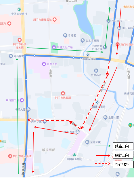調(diào)整后新增停靠站點(diǎn):瀏河橋(西側(cè))、金寧小區(qū)(西側(cè))、荊門(mén)電視臺(tái)(西側(cè))、鳳臺(tái)社區(qū)(北側(cè))、?;壑袑W(xué)(北側(cè))。