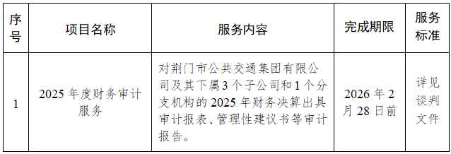 二、項(xiàng)目名稱(chēng):荊門(mén)市公共交通集團(tuán)有限公司2025年度財(cái)務(wù)審計(jì)服務(wù)項(xiàng)目