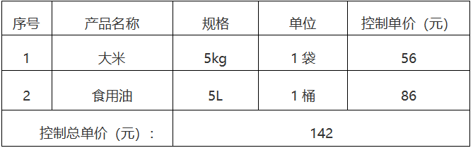 預(yù)算金額:本次詢價(jià)對大米、食用油的單價(jià)、合計(jì)總單價(jià)進(jìn)行詢價(jià),在各分類報(bào)價(jià)不超過控制單價(jià)(含稅)的前提下,控制總單價(jià)142元,超過此采購預(yù)算的報(bào)價(jià)無效。