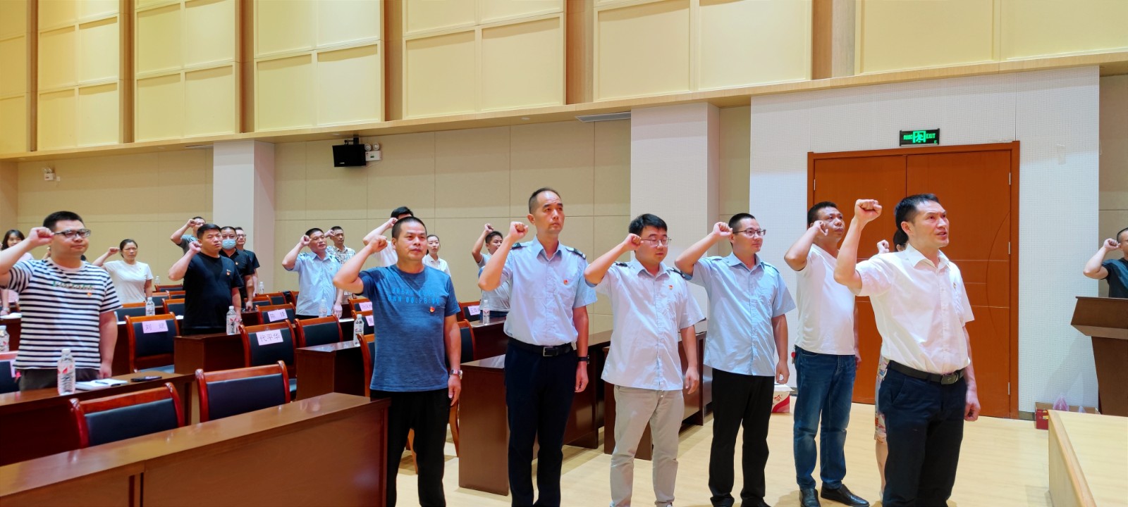在“七·一”黨員宣誓、“兩優(yōu)一先”表彰大會環(huán)節(jié)。大會首先伴隨著雄壯的國歌聲正式拉開序幕。然后,領誓人公汽一公司書記肖剛與新進正式黨員、納新預備黨員,以及在場老黨員們一起重溫了入黨誓詞。其次,新進正式黨員為納新的預備黨員佩戴了黨徽。